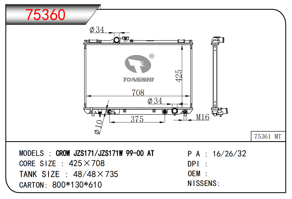 適用于奇瑞瑞虎(新款) MT散熱器 OEM : F1301000B1
