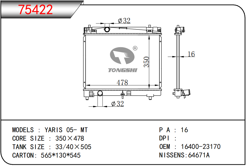 適用于奇瑞瑞虎(新款) MT散熱器 OEM : F1301000B1