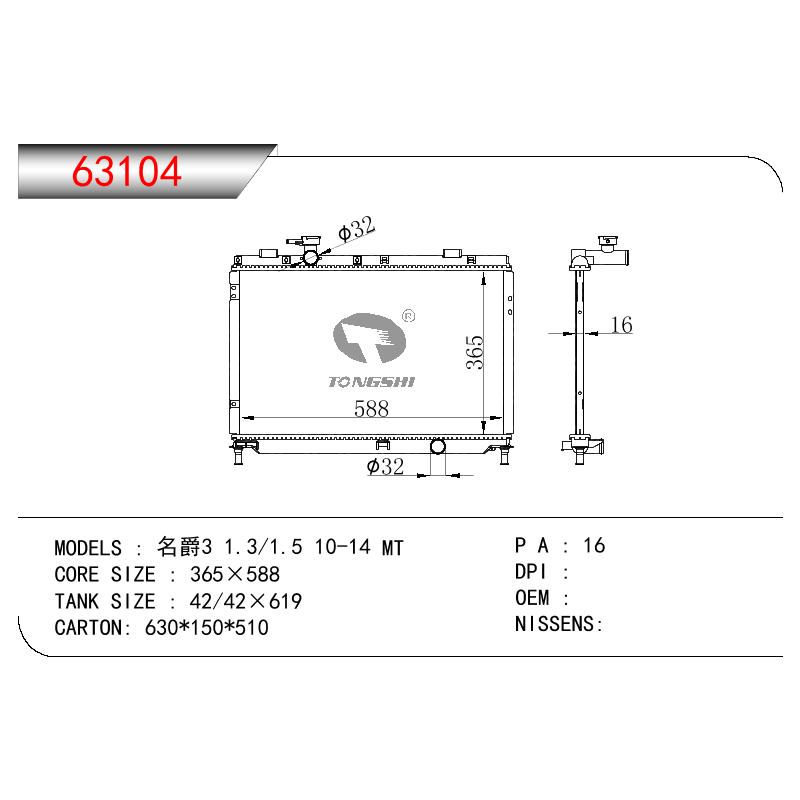 適用于奇瑞瑞虎(新款) MT散熱器 OEM : F1301000B1