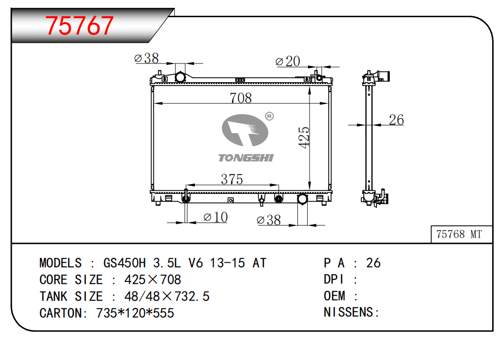 適用于奇瑞瑞虎(新款) MT散熱器 OEM : F1301000B1
