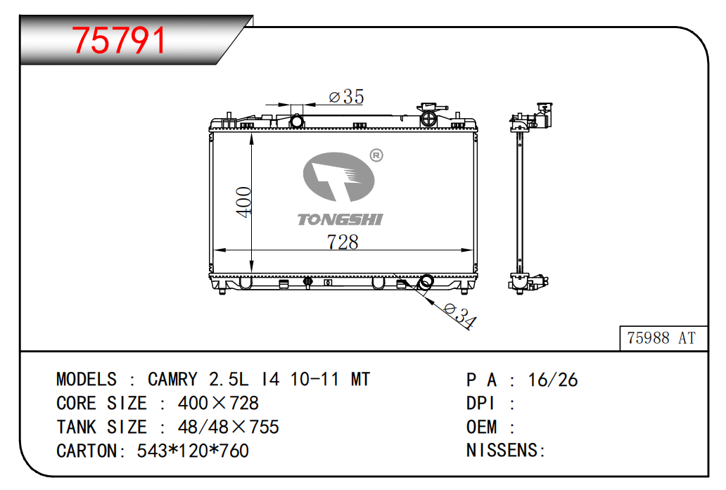 適用于奇瑞瑞虎(新款) MT散熱器 OEM : F1301000B1