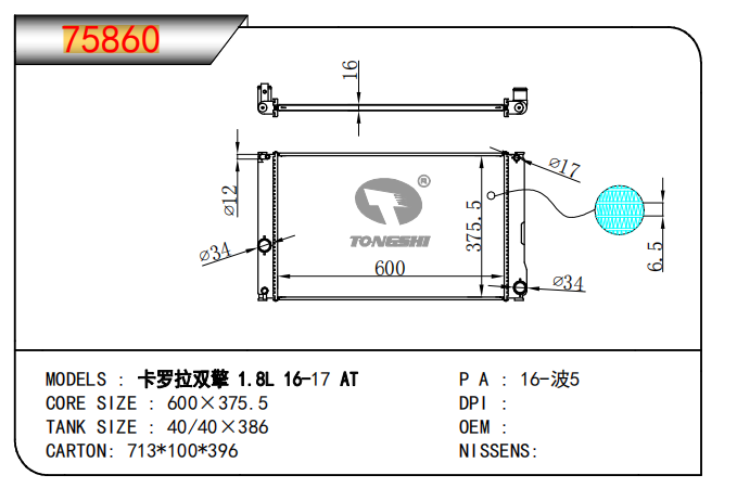 適用于奇瑞瑞虎(新款) MT散熱器 OEM : F1301000B1