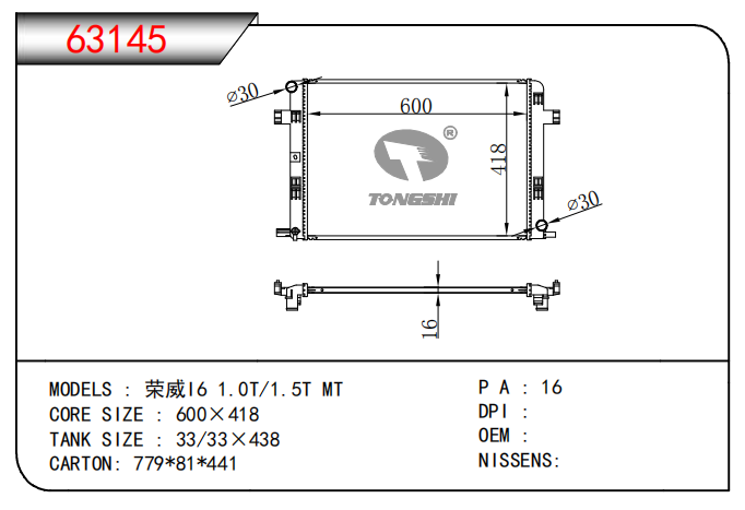 適用于奇瑞瑞虎(新款) MT散熱器 OEM : F1301000B1