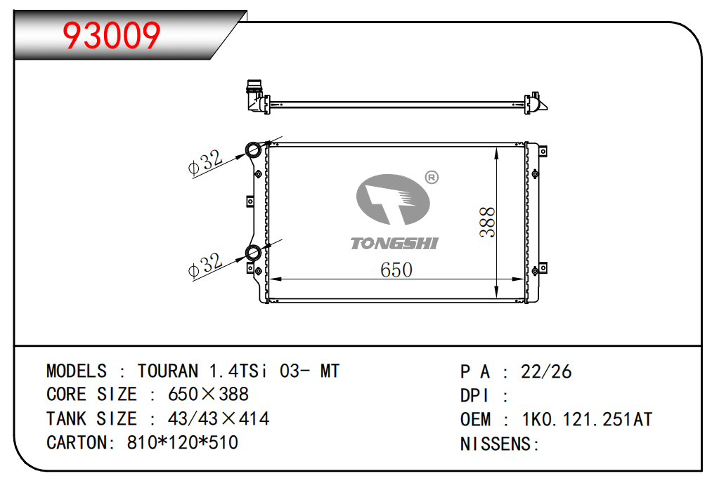 適用于奇瑞瑞虎(新款) MT散熱器 OEM : F1301000B1