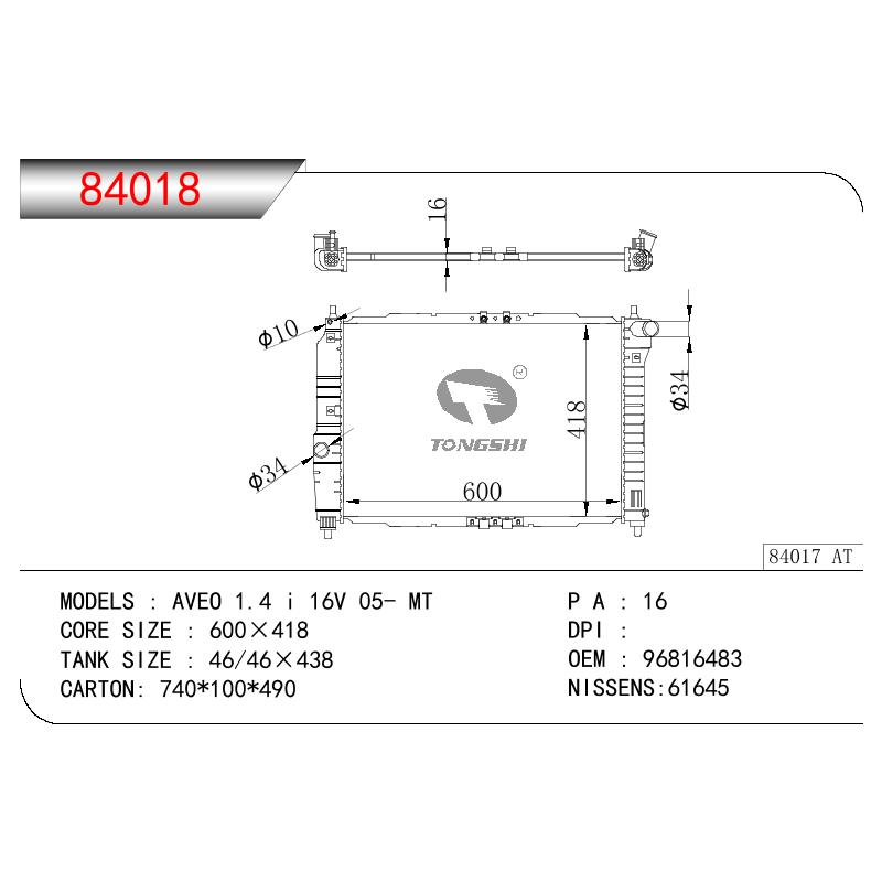 適用于奇瑞瑞虎(新款) MT散熱器 OEM : F1301000B1