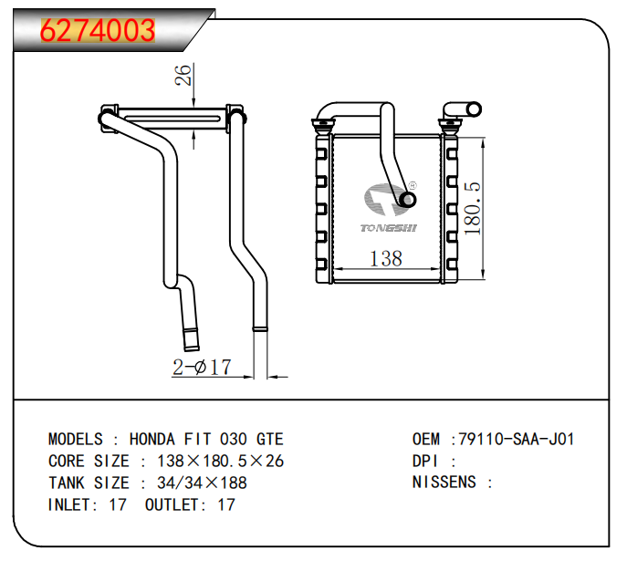適用于奇瑞瑞虎(新款) MT散熱器 OEM : F1301000B1