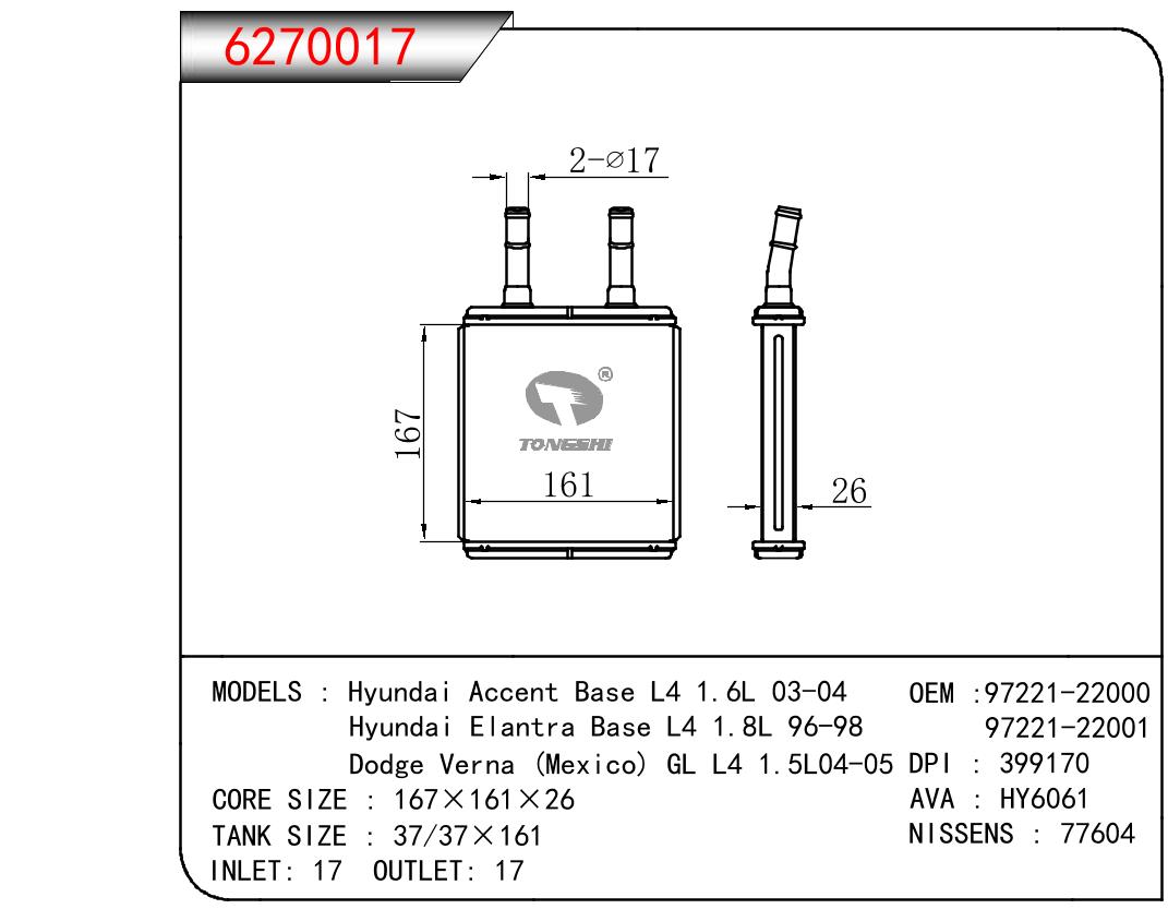 適用于現(xiàn)代雅紳特Base L4 1.6L 03-04/現(xiàn)代伊蘭特Base L4 1.8L 96-98/ 道奇 Verna 墨西哥版) GL L4 1.5L04-05暖風(fēng)OEM :97221-2200