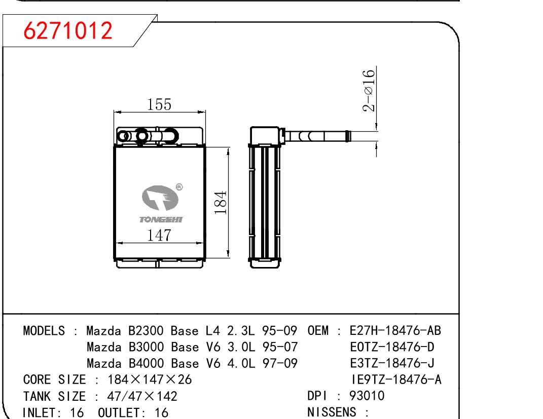 適用于MAZDA Mazda B2300 Base L4 2.3L 95-09/Mazda B3000 Base V6 3.0L 95-07/Mazda B4000 Base V6 4.0L 97-09 OEM:E27H18476AB/EOTE18476D/E3TZ18476J/IE9TZ18476A
