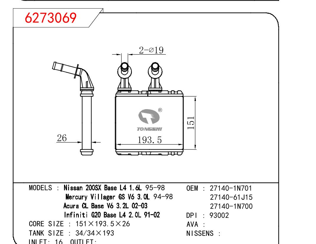 適用于NISSAN NISSAN 200SX BASE L4 1.6L 95-98/MERCURY VILLAGER GS V6 3.0L 94-98/ACURA CL BASE V6 3.2L 02-03/INFINITI G20 BASE L4 2.0L 91-02 OEM:27140-1N701/27140-61J15/27140-1N700
