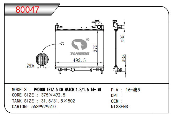 適用于奇瑞瑞虎(新款) MT散熱器 OEM : F1301000B1