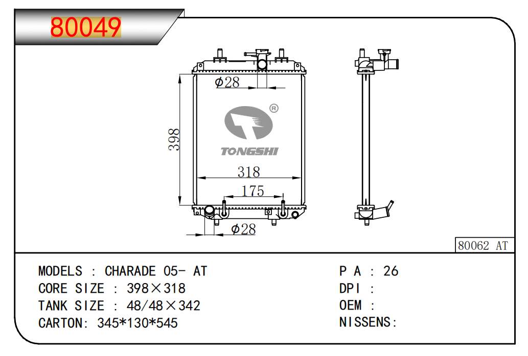 適用于奇瑞瑞虎(新款) MT散熱器 OEM : F1301000B1