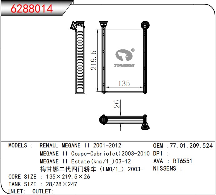 適用于奇瑞瑞虎(新款) MT散熱器 OEM : F1301000B1