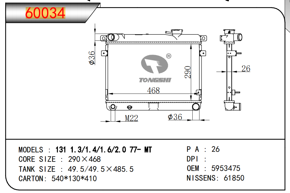 適用于奇瑞瑞虎(新款) MT散熱器 OEM : F1301000B1
