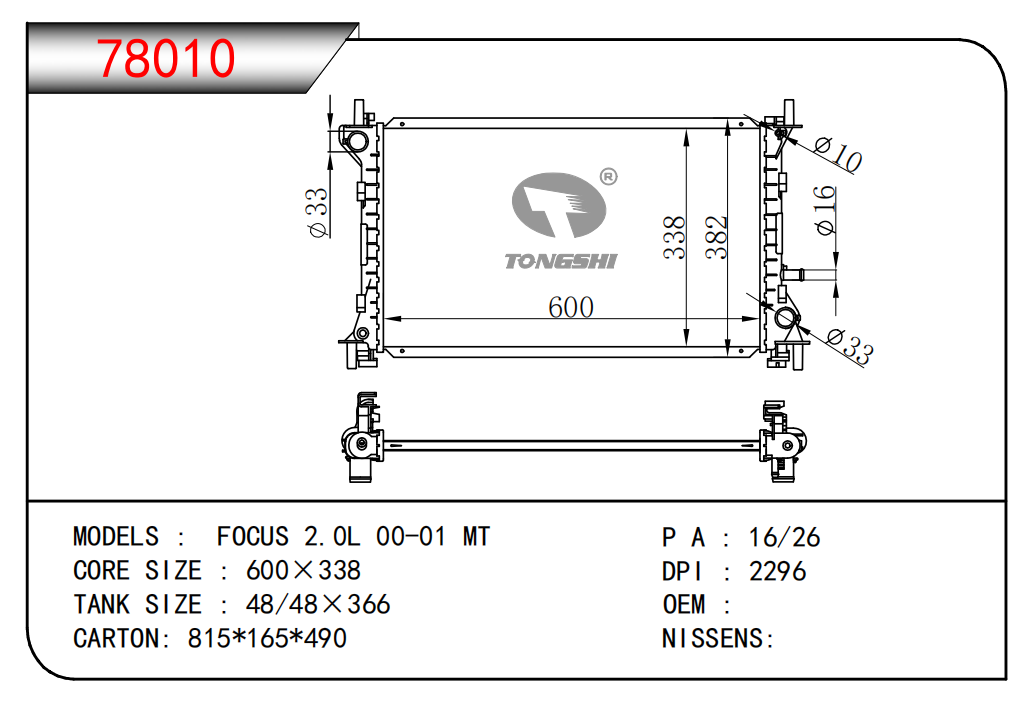 適用于奇瑞瑞虎(新款) MT散熱器 OEM : F1301000B1