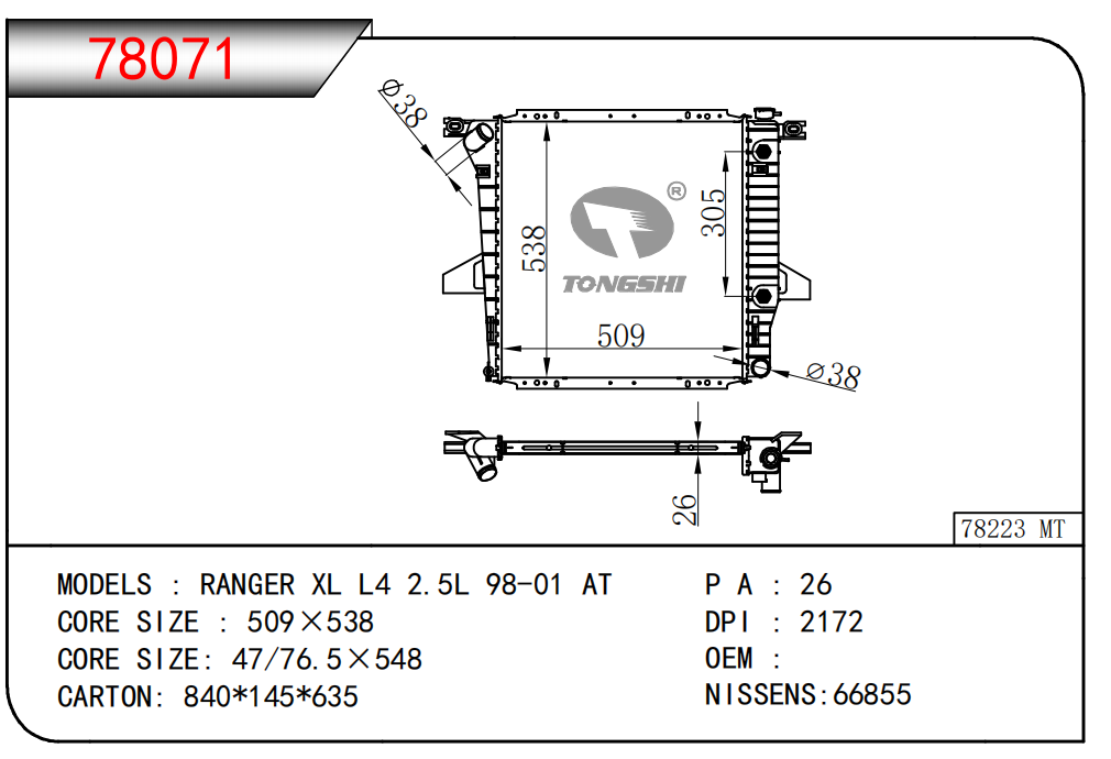 適用于奇瑞瑞虎(新款) MT散熱器 OEM : F1301000B1