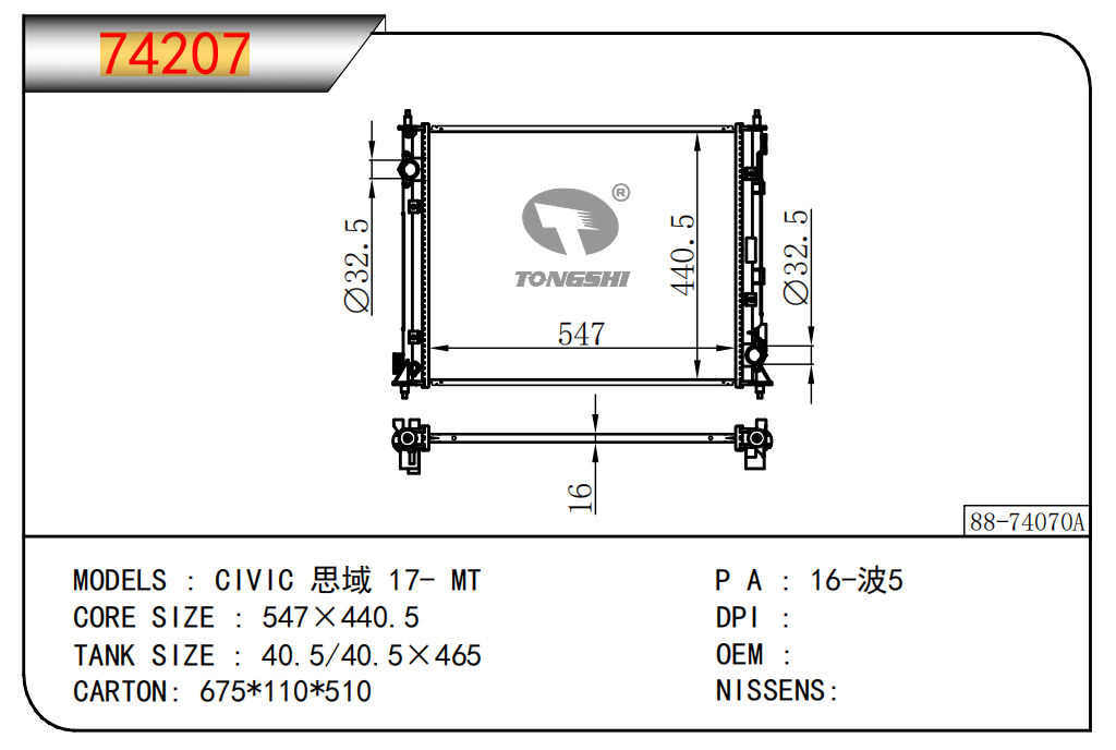 適用于奇瑞瑞虎(新款) MT散熱器 OEM : F1301000B1