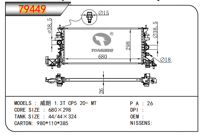 適用于奇瑞瑞虎(新款) MT散熱器 OEM : F1301000B1