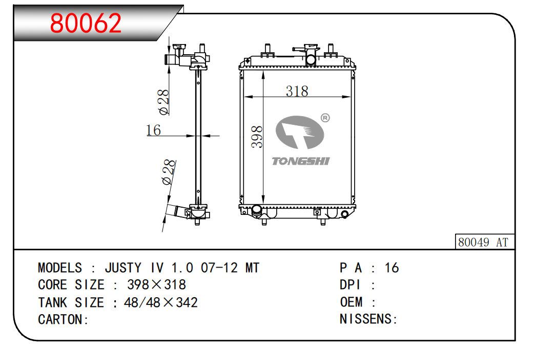 適用于奇瑞瑞虎(新款) MT散熱器 OEM : F1301000B1