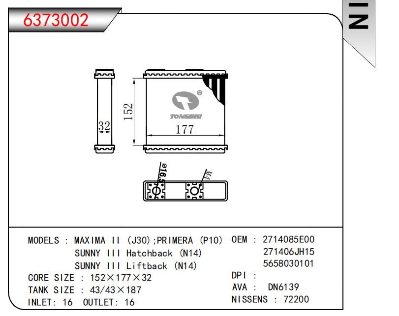 適用于MAXIMA II (J30):PRIMERA (P10)SUNNY III Hatchback (N14)SUNNY IlI Liftback (N14) OEM:2714085E00,271406JH15,5658030101