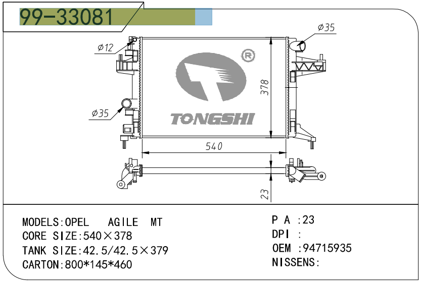 適用于奇瑞瑞虎(新款) MT散熱器 OEM : F1301000B1