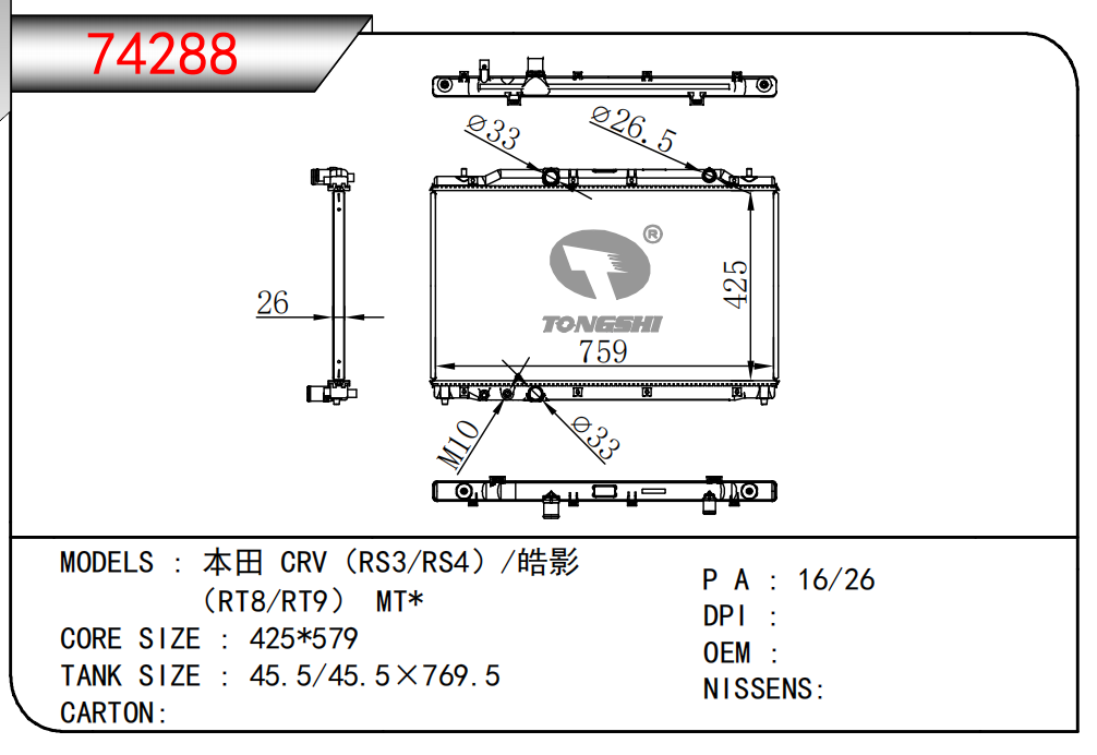 適用于奇瑞瑞虎(新款) MT散熱器 OEM : F1301000B1