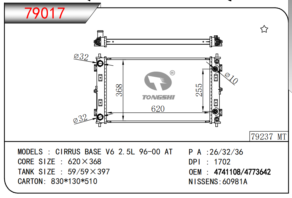 適用于奇瑞瑞虎(新款) MT散熱器 OEM : F1301000B1