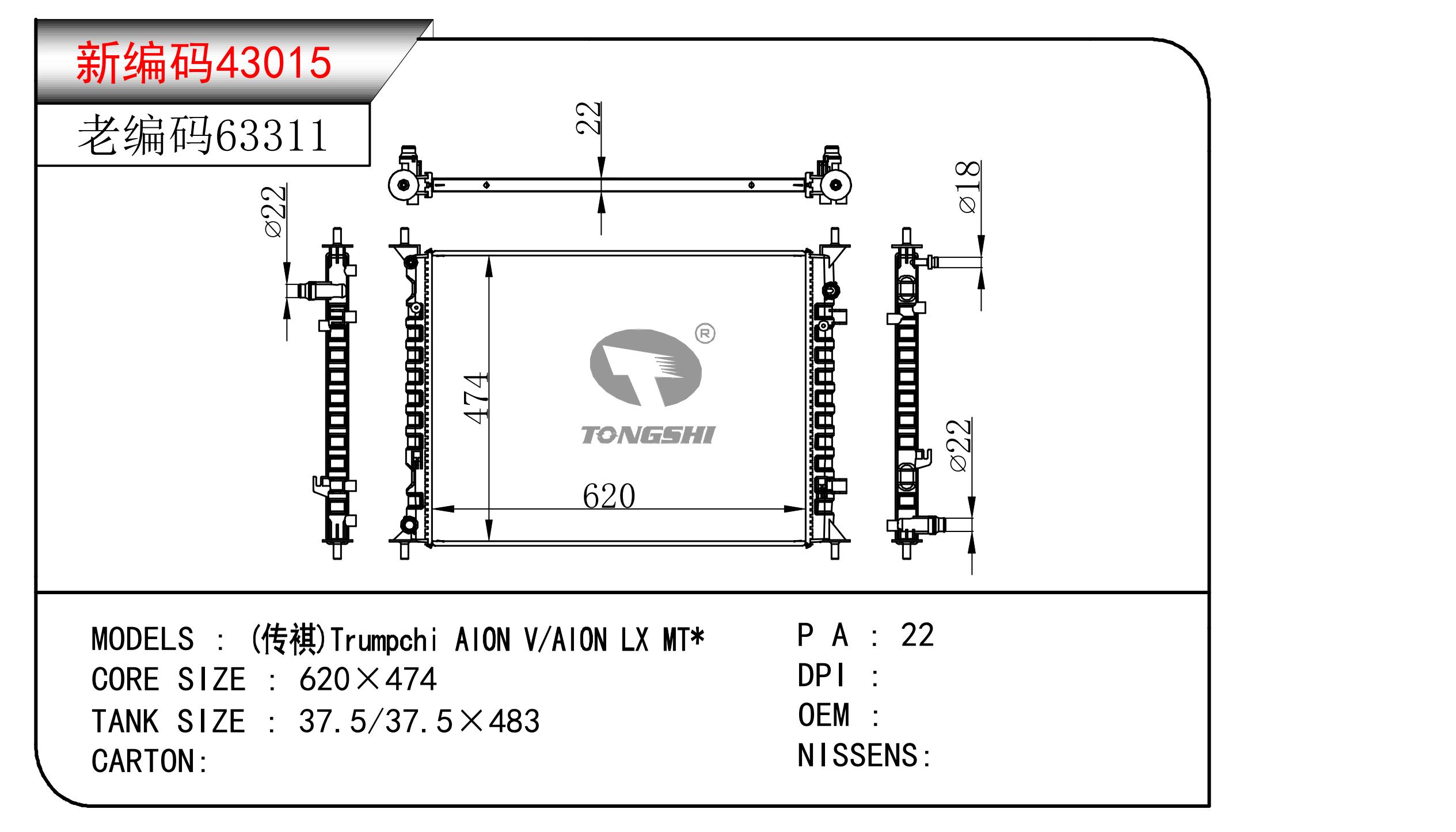 適用于奇瑞瑞虎(新款) MT散熱器 OEM : F1301000B1