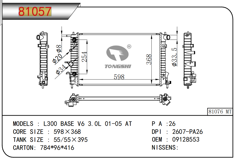 適用于奇瑞瑞虎(新款) MT散熱器 OEM : F1301000B1