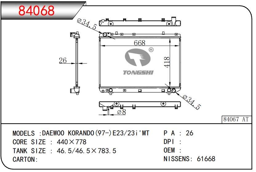 適用于奇瑞瑞虎(新款) MT散熱器 OEM : F1301000B1